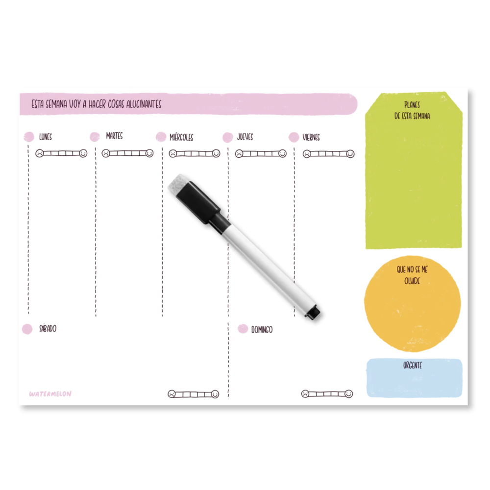 Perfecta para organizar tus días ✅Pendientes 🍎 menu semanal y mucho mas 😍 Incluye marcador de pizarra para escribir y borrar cuantas veces quieras. Medidas: 21 x 29 cm.