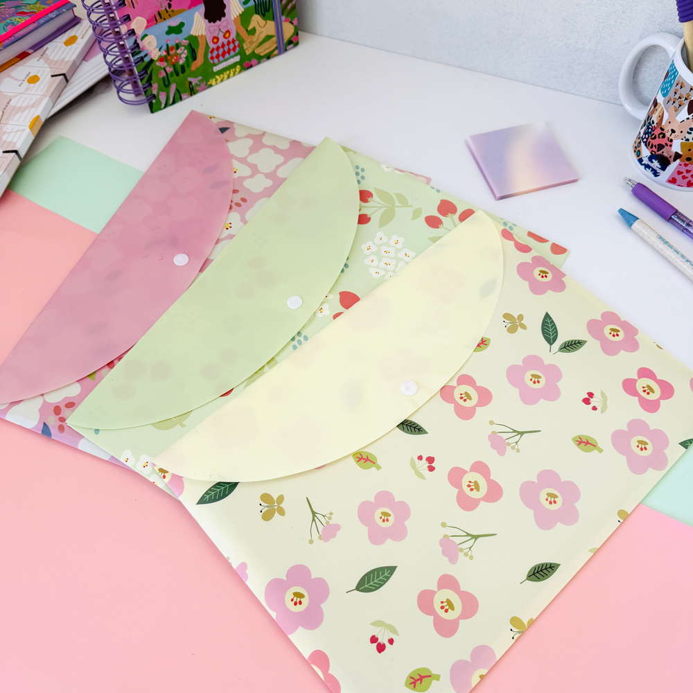 Sobre con botón Del tamaño perfecto para guardar documentos, separar tus apuntes, llevan tus cuadernos, manteniendo todo protegido 🤓 De los diseños mas lindos🌸 Material: Plástico Medidas: A4