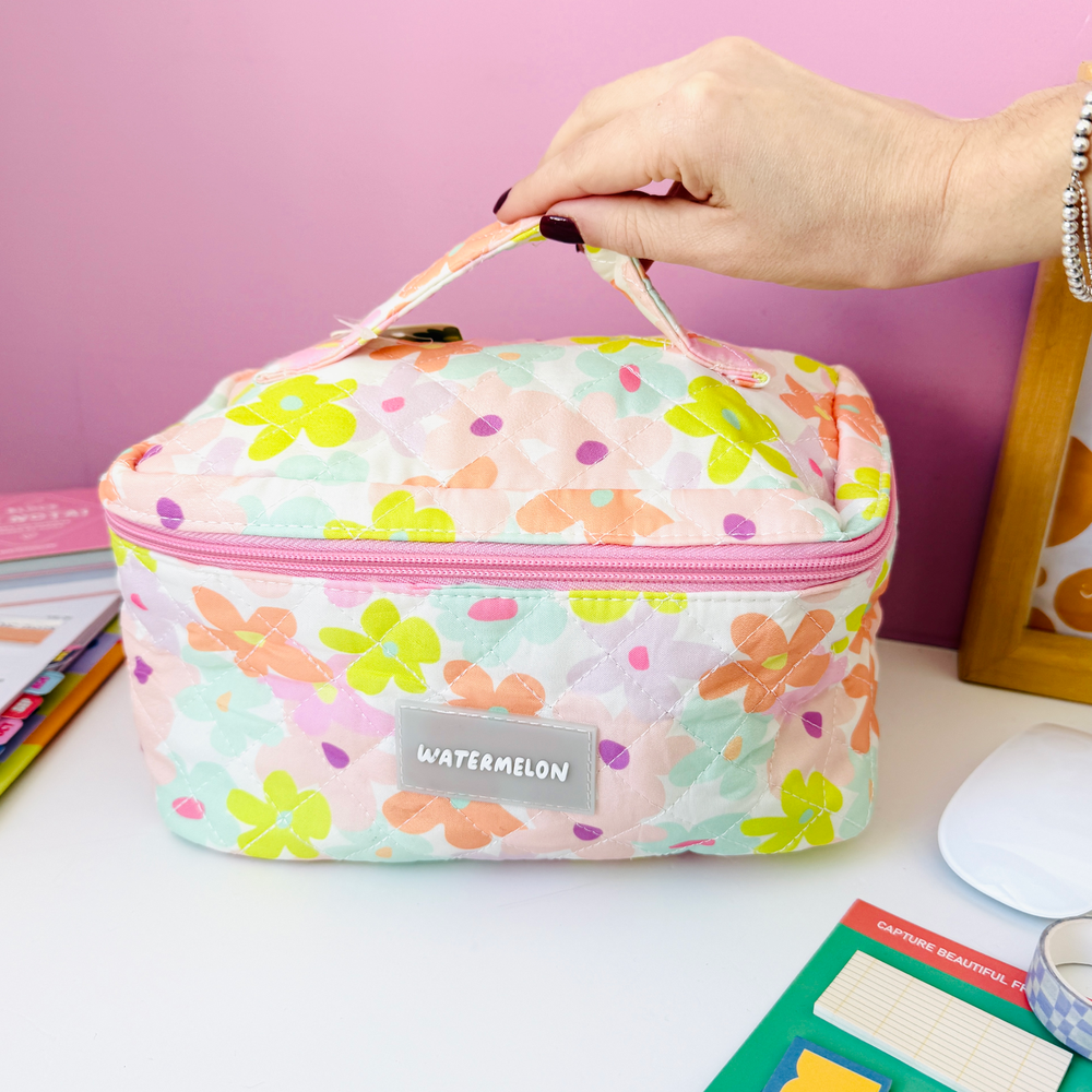 Cuenta con un amplio compartimento principal, bolsillo de red en la tapa interior para organizar y manija superior para llevarlo fácilmente 👜 💄
