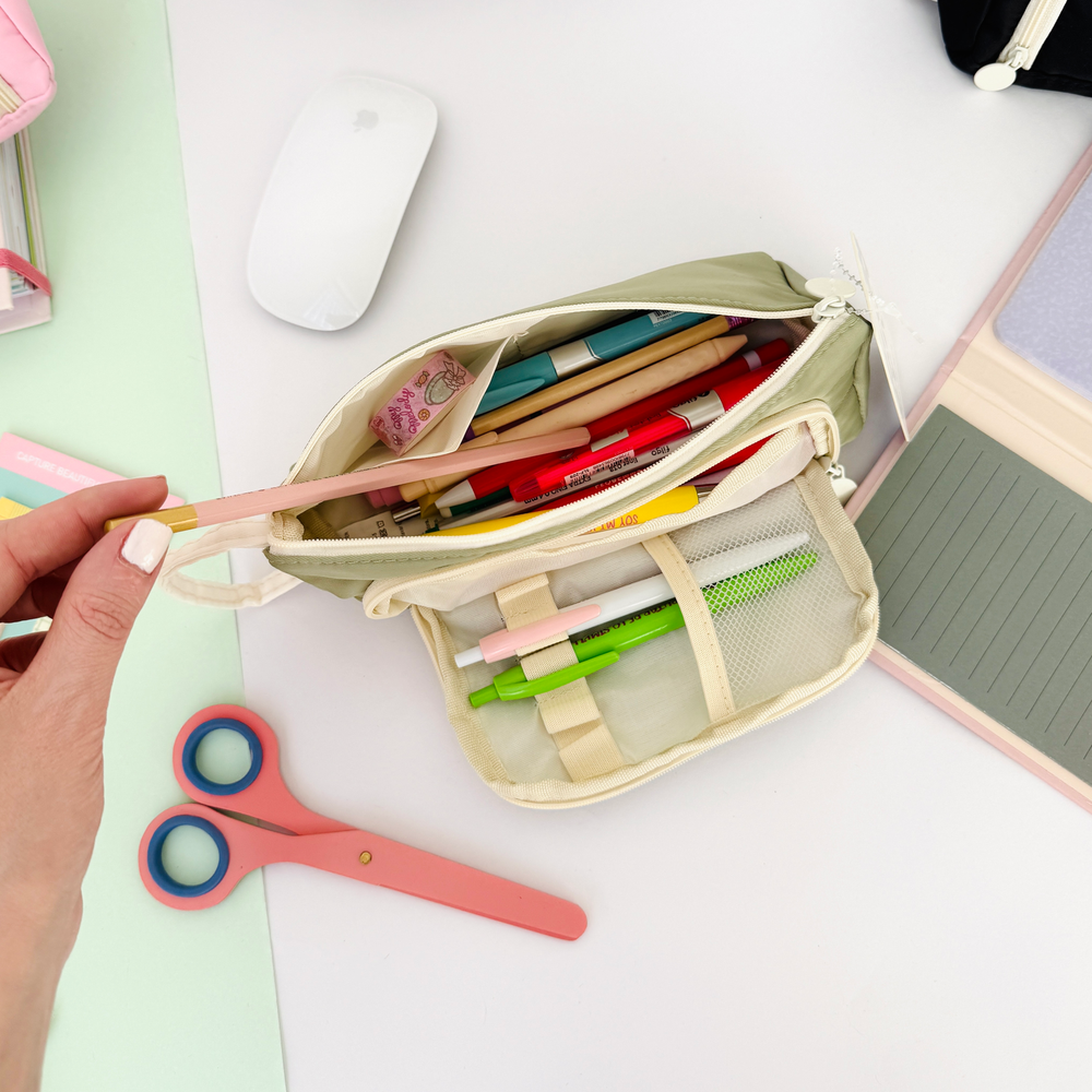 ✅Cierre principal amplio con gran capacidad para resaltadores, lápices y materiales escolares.